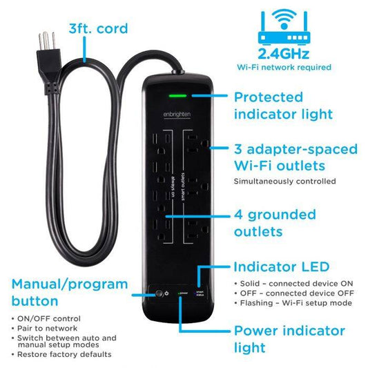 Enbrighten WiFi Controlled Surge Protector Power Bar, 3 FT Extension Cord, Black (54525)