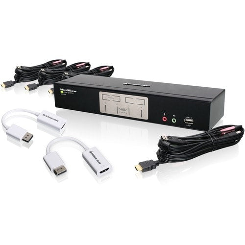 IOGEAR's HD and DisplayPort KVM Solution enables effortless control over 4 HDMI or DisplayPort computers using a single USB keyboard, USB mouse and single high definition display (720P or 1080P) or HDTV. This bundle is perfect for a home office or small / medium size business, as it offers the flexibility of choosing between HD and/or DisplayPort connections. Take advantage of your existing computers, and use the included DisplayPort adapters to display content from your DisplayPort enabled devices on a large external HDMI display or HDMI projector.