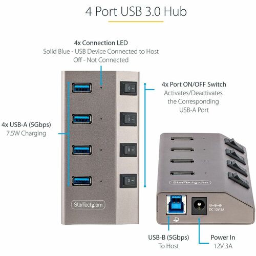 Hub USB-C 4 ports StarTech.com - 4 ports USB 3.0 Type-A avec interrupteurs marche/arrêt individuels