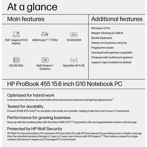 HP Inc. HP ProBook 455 G10 15.6" Notebook - Full HD - AMD Ryzen 7 7730U - 16 GB - 512 GB SSD - Pike Silver Plastic - AMD Chip - 1920 x 1080 - Windows 11 Pro - AMD Radeon Graphics - In-plane Switching (IPS) Technology - Front Camera/Webcam - IEEE 802.11ax Wireless LAN Standard
