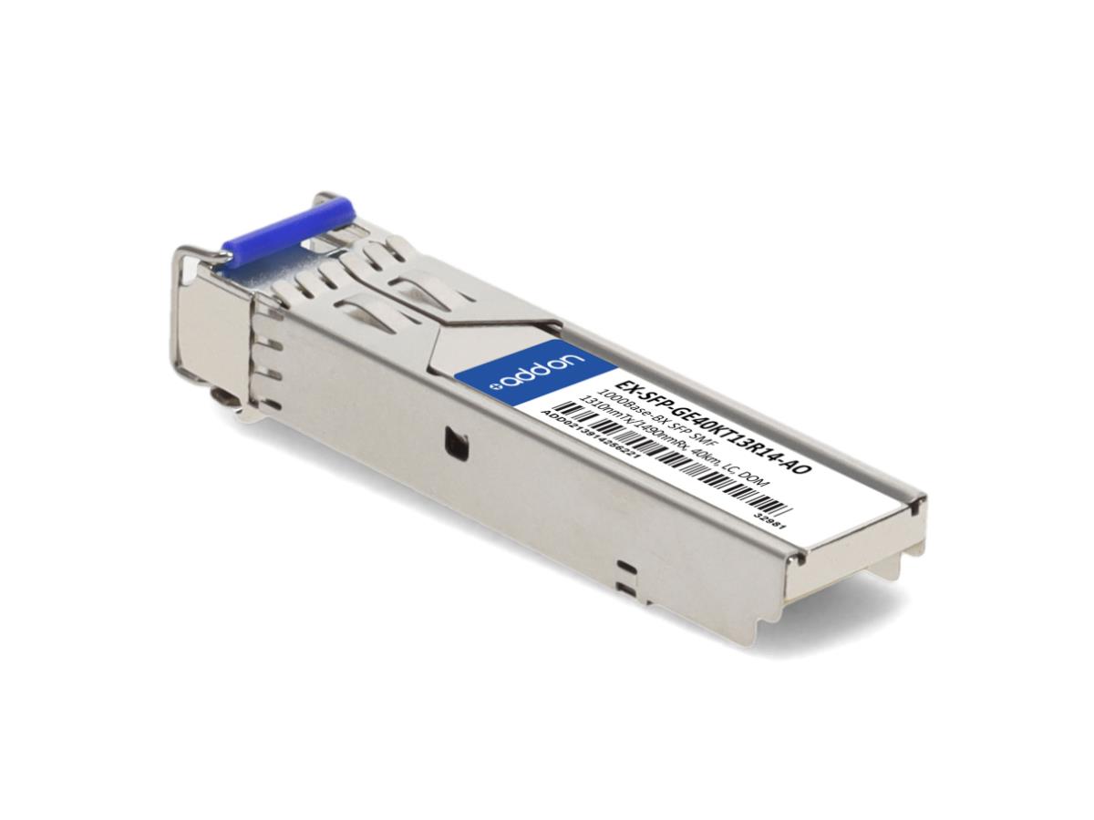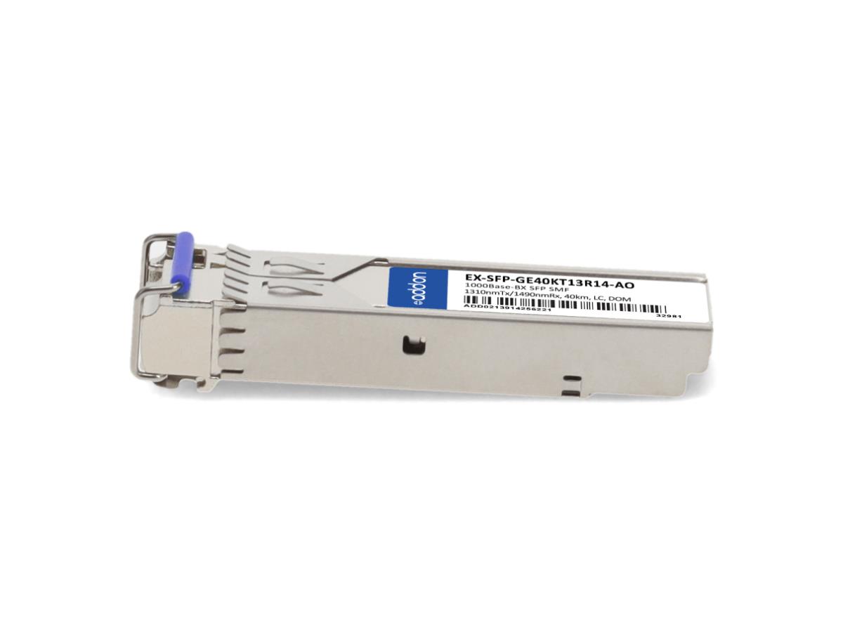 Juniper Networks EX-SFP-GE40KT13R14 Compatible 1000Base-BX SFP Transceiver (SMF, 1310nmTx/1490nmRx, 40km, LC, DOM). A 100% Juniper Networks compatible SFP transceiver that operates at 1310nmTx/1490nmRx over single-mode fiber, with a maximum reach of 40km connected via a LC connector. This Juniper Networks SFP transceiver is 100% compliant with its designed networking application, and is factory programed with Juniper Networks specific configuration data required for seamless networking integration. This SFP transceiver will initialize and perform identically to Juniper Networks' transceiver and is built to meet or exceed Juniper Networks' specifications, and comply with MSA (Multi-Source Agreement) standards. The actual part shipped may have a different part number, but will be functionally identical and 100% compatible. Trade Agreements Act (TAA) versions of this part are available.