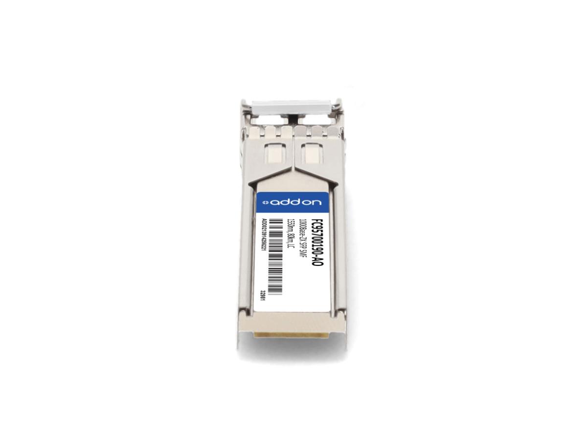 This Fujitsu FC95700190 compatible SFP transceiver provides 1000Base-ZX throughput up to 80km over single-mode fiber (SMF) at a wavelength of 1550nm using a LC connector. It is guaranteed to be 100% compatible with the equivalent Fujitsu transceiver. This easy to install, hot swappable transceiver has been programmed, uniquely serialized and data-traffic and application tested to ensure that it will initialize and perform identically. It is built to meet or exceed the specifications of Fujitsu, as well as to comply with MSA (Multi-Source Agreement) standards to ensure seamless network integration. All of our transceivers are Trade Agreements Act (TAA) compliant. We stand behind the quality of our products and proudly offer a limited lifetime warranty.