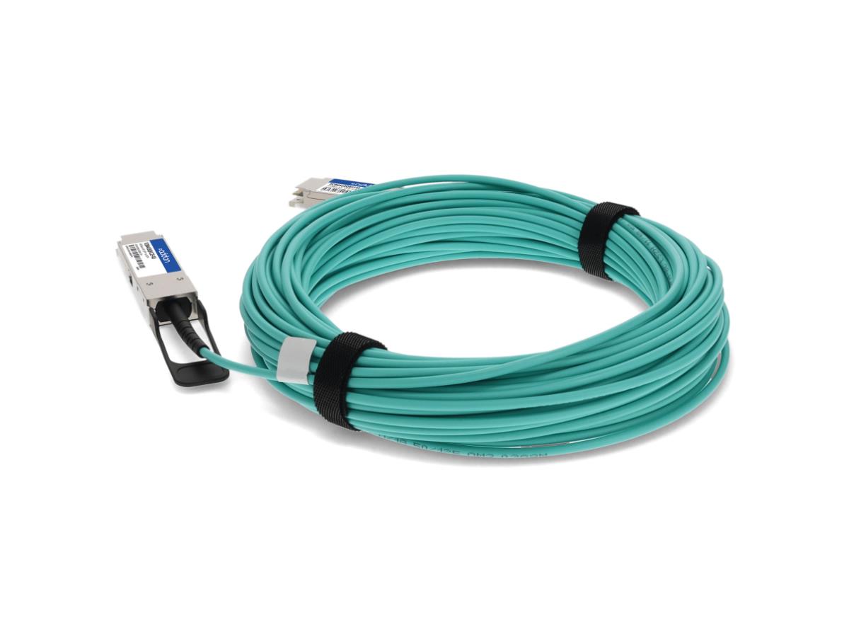 This is a Finisar FCBN410QB1C25 compatible 40GBase-AOC QSFP+ to QSFP+ active optical cable that operates over multi-mode fiber with a maximum reach of 25.0m (82.0ft). At a wavelength of 850nm, it has been programmed, uniquely serialized, and data-traffic and application tested to ensure it is 100% compliant and functional. This active optical cable is TAA (Trade Agreements Act) compliant, and is built to comply with MSA (Multi-Source Agreement) standards. We stand behind the quality of our products and proudly offer a limited lifetime warranty.
