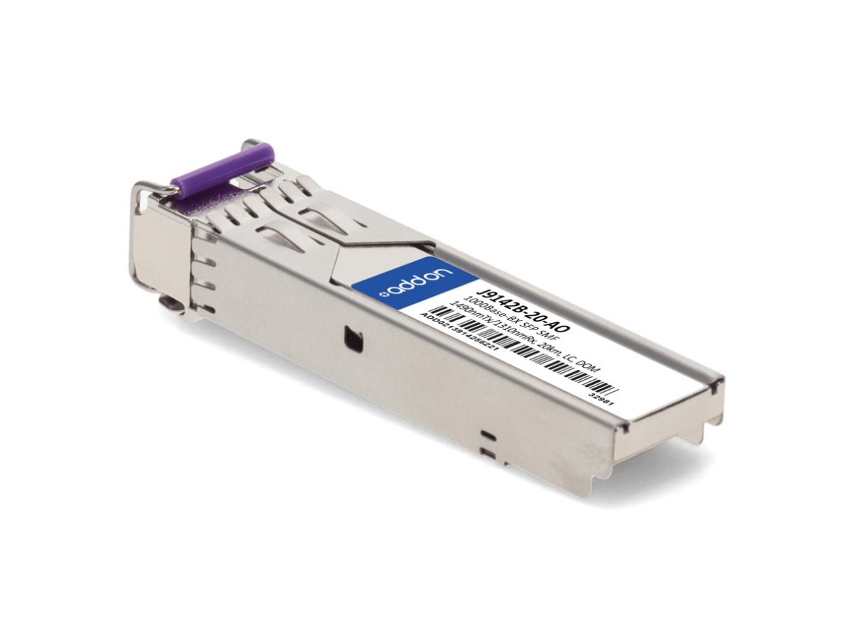 This HP J9142B compatible SFP transceiver provides 1000Base-BX throughput up to 20km over single-mode fiber (SMF) at a bidirectional wavelength of 1490nmTx/1310nmRx using a LC connector. It is guaranteed to be 100% compatible with the equivalent HP transceiver. This easy to install, hot swappable transceiver has been programmed, uniquely serialized and data-traffic and application tested to ensure that it will initialize and perform identically. Digital optical monitoring (DOM) support is also present to allow access to real-time operating parameters. All of our transceivers are Trade Agreements Act (TAA) compliant. We stand behind the quality of our products and proudly offer a limited lifetime warranty.
