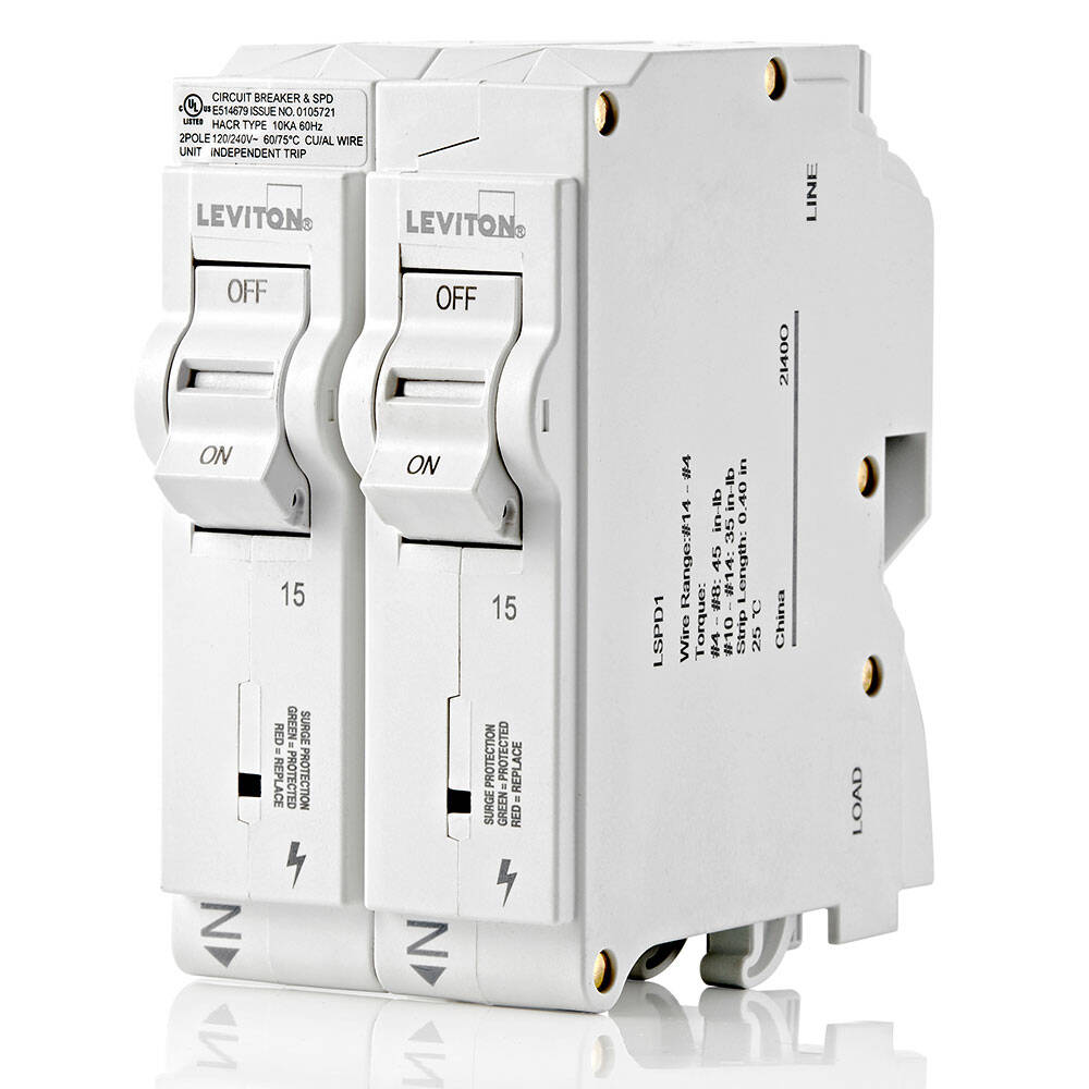 The LSPD1 surge protective device from Leviton features two 15A 1-pole hydraulic magnetic branch circuit breakers that use hydraulic magnetic trip technology and plug-on installation with type-1 surge protection.