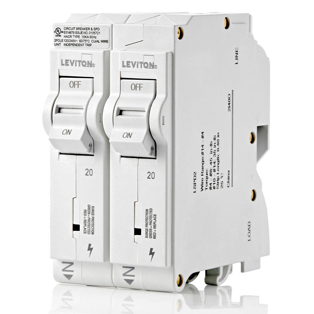 The LSPD2 from Leviton is a surge protector device that features two 20A 1-pole standard hydraulic magnetic branch circuit breakers. The breakers make use of hydraulic magnetic trip technology and plug-on installation while offering type-1 surge protection for the whole home.