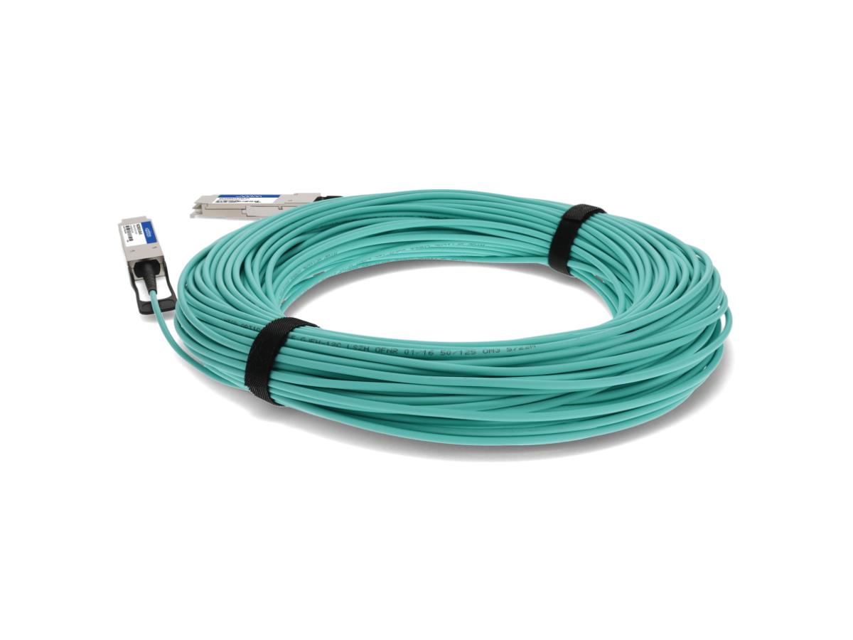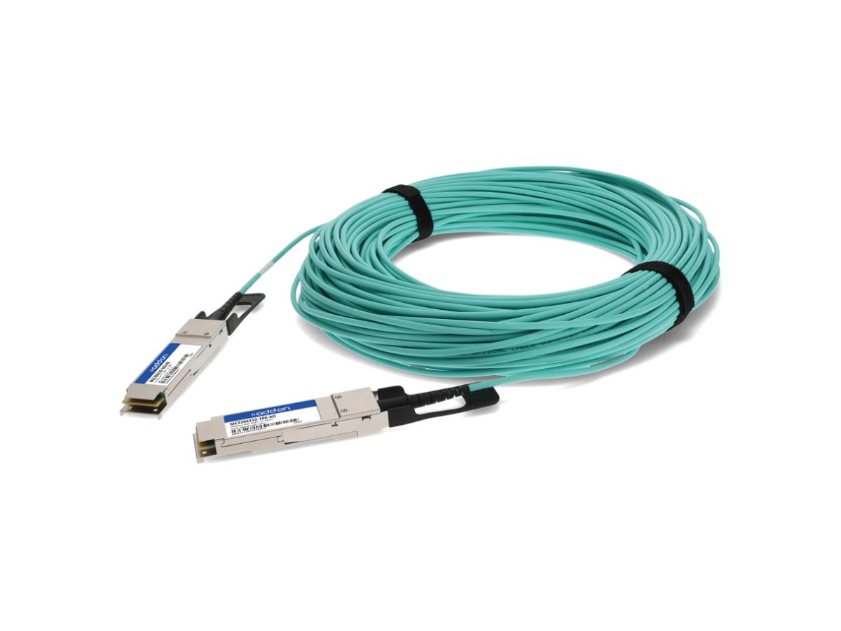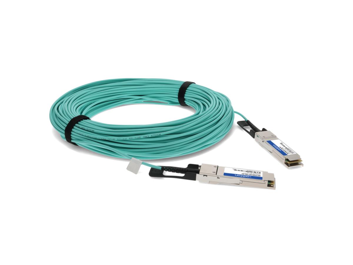 Mellanox MC2206310-100 compatible 40GBase-AOC QSFP+ to QSFP+ direct attach cable (850nm, MMF, 100m). A 100% Mellanox compatible 40GBase-AOC QSFP+ to QSFP+active-optical direct attached cable that operates at 850nm over multi-mode fiber, with a maximum reach of 100.00m (328.08ft).