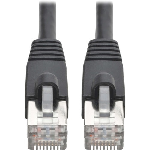 High-Speed Cat6a STP Patch Cable Ideal for Your 10GBase-T Ethernet NetworkDesigned for fast transmission and excellent signal quality, this 35-ft. (10.67 m) Cat6a cable ensures peak performance throughout your local area network (LAN). It transmits 10 Gbps data, voice and video through high-speed 10G equipment, including network switches, modems, routers, adapters, hubs and patch panels. It reduces impedance and structural return loss compared to standard 100 MHz wire. Supports Power over Ethernet (PoE) to Cut Down on Power SuppliesBecause this Cat6a shielded cable supports PoE, it can supply the power to operate compatible PoE devices, such as security cameras, VoIP telephones, point-of-sale kiosks and access control devices. This saves you the expense and effort of purchasing, connecting and installing individual power supplies for each device. Premium Protection from EMI/RFI Line Noise Helps Your Equipment Perform BetterVarious electromagnetic and radio sources found in virtually every home and business can cause disruptive interference on the AC line. Known as EMI (electromagnetic interference) and RFI (radio frequency interference), this line noise is a common cause of performance problems. The N262-035-BK shields against disruptive line noise that can disturb your electronics and inflict hardware damage or data loss. This EMI/RFI filtering also helps your connected components perform better and last longer. Snagless RJ45 Male Connectors Add Extra Protection During InstallationThe RJ45 connectors' snagless design protects the locking tabs from being damaged or broken off during installation. The ends are shielded to minimize near-end crosstalk (NEXT) levels. Integral strain relief gives the N262-035-BK extra flexibility, reduces stress, and helps the cable move freely without cracking or breaking loose from the connector. Color-Coded to Avoid Misidentification That Can Cause Costly DowntimeThis Cat6a STP patch cable features a black PVC jacket. The color-coding allows easy, fast identification in a crowded rack or workstation, preventing technicians from accidentally disconnecting the wrong cable.
