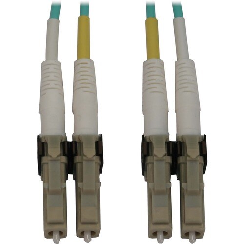 The OM3-rated cable has an aqua jacket to identify it as multimode in a crowded patch panel or switch and prevent it from becoming accidentally disconnected. The round low-smoke zero-halogen (LSZH) jacket limits the amount of toxic smoke emitted in case of combustion, making it suitable for poorly ventilated areas.
