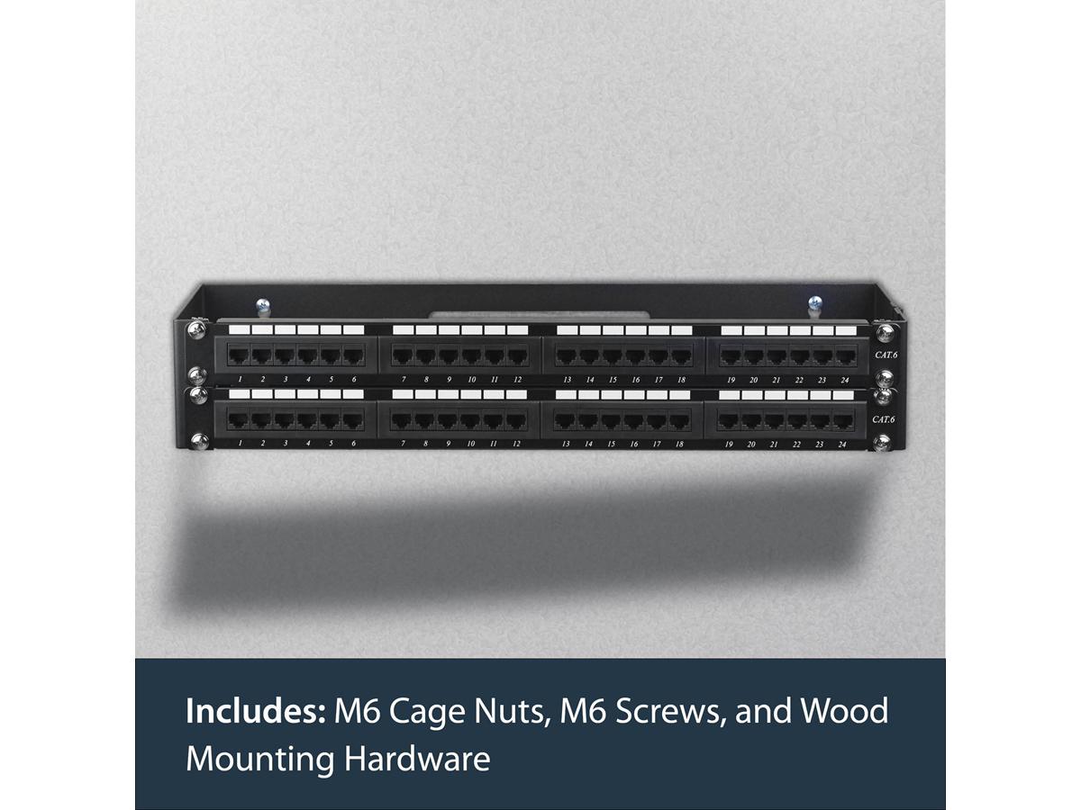 The patch panel wall mount features a hinged design for easy access to configuration buttons, ports and cables. The wall mounting holes are spaced 16 in. apart, making it suitable for mounting on almost any wall, based on common wall-frame stud spacing.